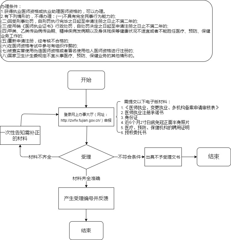(二)有下列情形的,不得辦理:(一)不具有完全民事行為能力的; (二)因受刑事處罰,自刑罰執行完畢之日起至申請注冊之日止不滿二年的; (三)受吊銷《醫師執業證書》行政處罰,自處罰決定之日起至申請注冊之日止不滿二年的; (四)甲類、乙類傳染病傳染期、精神疾病發病期以及身體殘疾等健康狀況不適宜或者不能勝任醫療、預防、保健業務工作的; (五)重新申請注冊,經考核不合格的; (六)在醫師資格考試中參與有組織作弊的; (七)被查實曾使用偽造醫師資格或者冒名使用他人醫師資格進行注冊的; (八)國家衛生計生委規定不宜從事醫療、預防、保健業務的其他情形的。