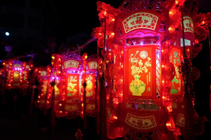 元宵迎花燈是下洋鎮一年中最重大的民俗活動,各村都有舉辦,一般從正月十三持續到正月十五。而中川村的元宵“迎花燈”,是這里一年中最大、最具特色的民俗文娛活動。因“迎燈”在客家話中與“迎丁”諧音,含人丁興旺吉兆,所以為中川人情有獨鐘。出巡隊伍所到之處,人潮如涌,鼓樂喧天,煙花、鞭炮聲此起彼落。“我們是特地到這里來看花燈的,各種各樣寫滿祝福的花燈,讓我們目不暇接。能看到這么好看的花燈,真的是太開心了。”游客張女士開心的說道。
